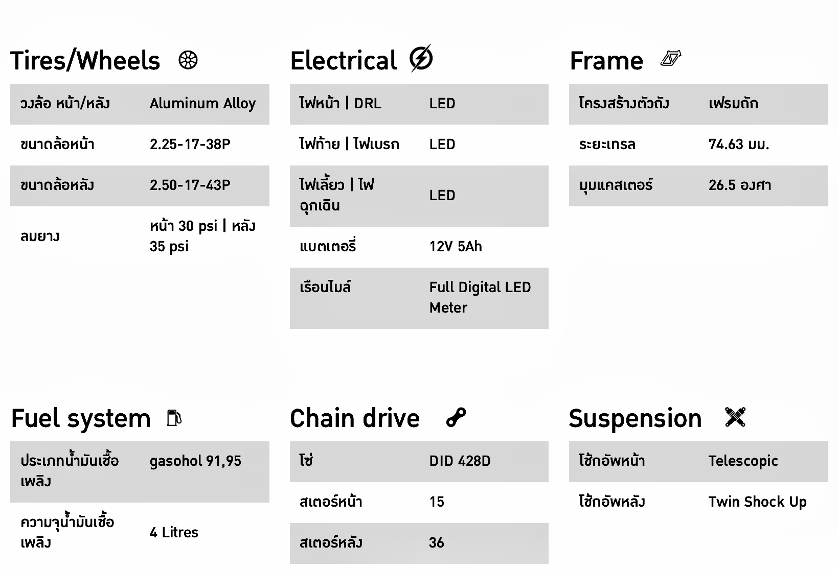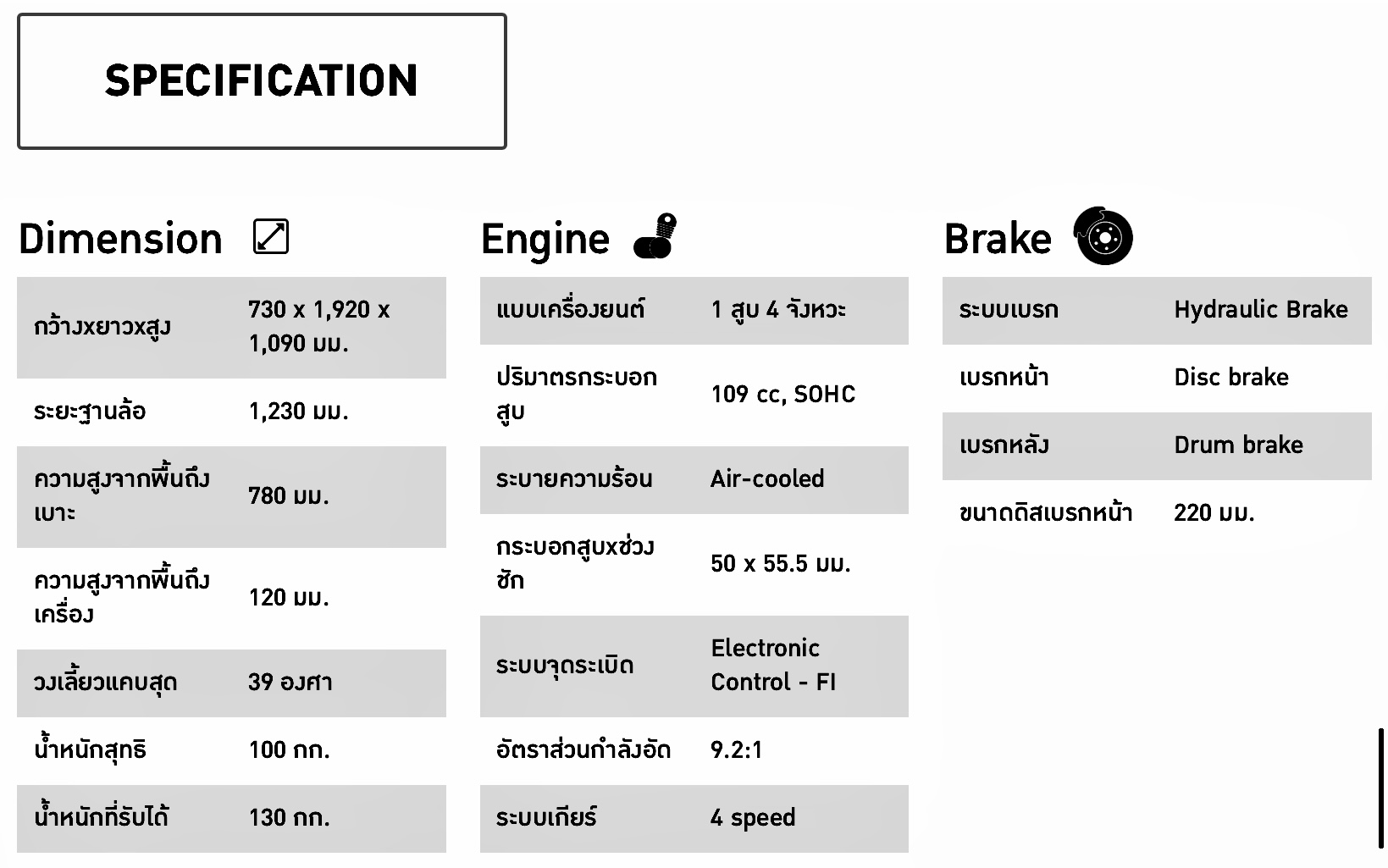 เครื่องยนต์ เป็นแบบ 4 จังหวะ 1 สูบ SOHC ความจุ 109 ซีซี. ระบายความร้อน Air-cooled กระบอกสูบ x ช่วงชัก 50 x 55.5 มม. เกียร์ 4 สปีด